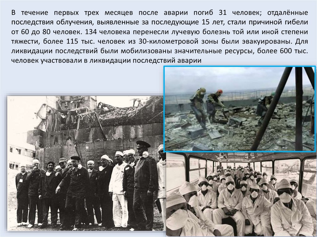 В течение первых трех месяцев после аварии погиб 31 человек; отдалённыепоследствия облучения, выявленные за последующие 15 лет, стали причиной гибели