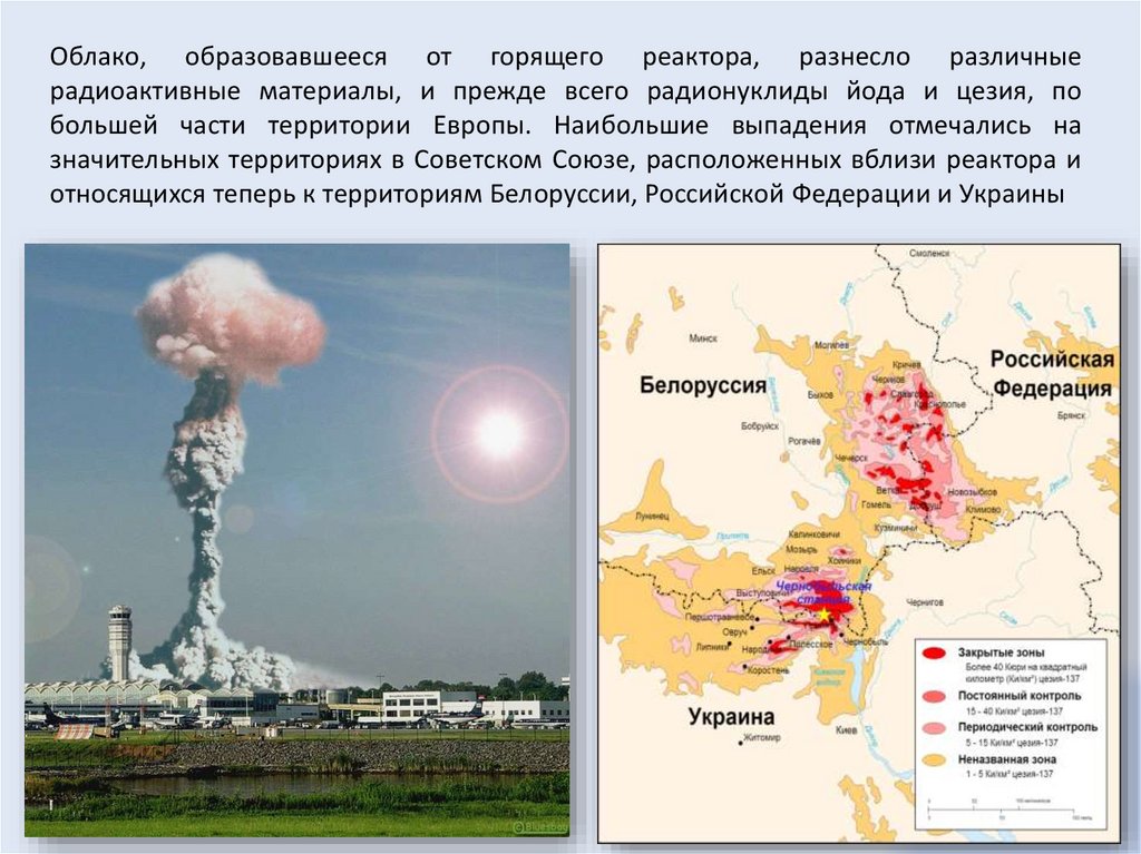 Облако, образовавшееся от горящего реактора, разнесло различныерадиоактивные материалы, и прежде всего радионуклиды йода и цезия, по