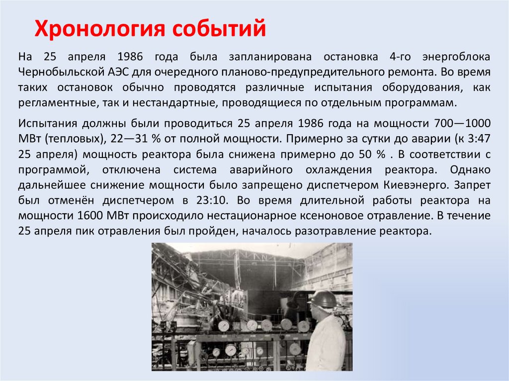 Хронология событийНа 25 апреля 1986 года была запланирована остановка 4-го энергоблока