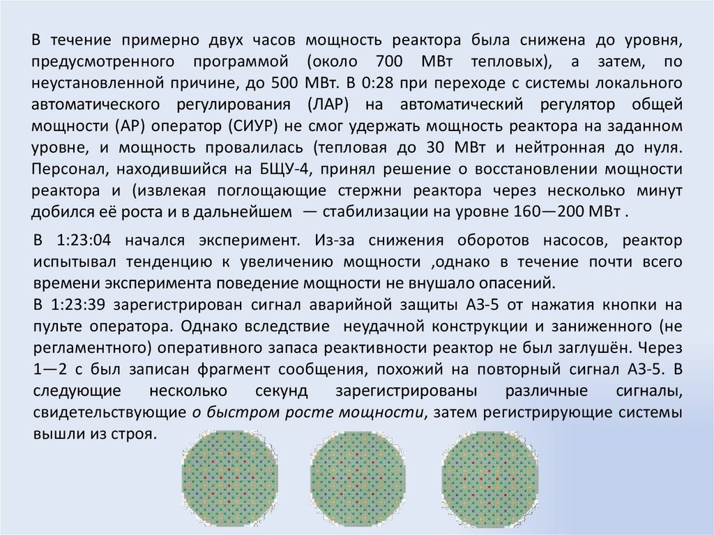 МВт (тепловых), 22—31 % от полной мощности. Примерно за сутки до аварии (к 3:47