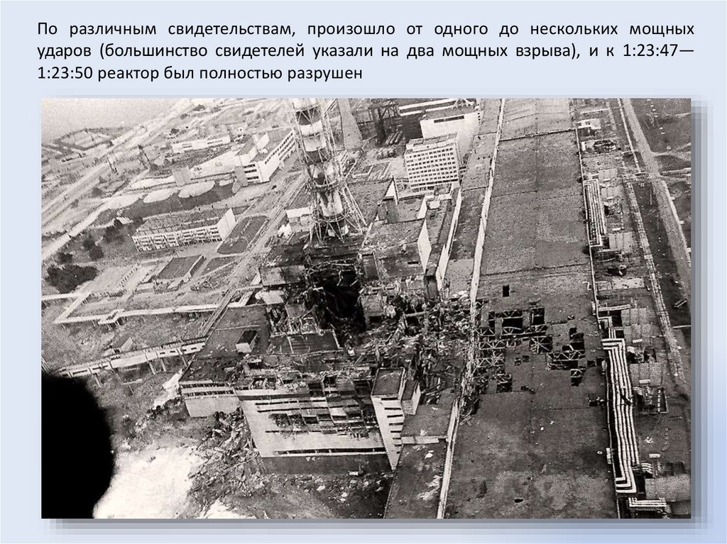 взрыв, который полностью разрушил реактор. Здание энергоблока частично