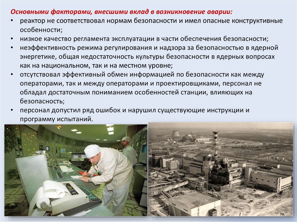 Основными факторами, внесшими вклад в возникновение аварии:• реактор не соответствовал нормам безопасности и имел опасные конструктивные