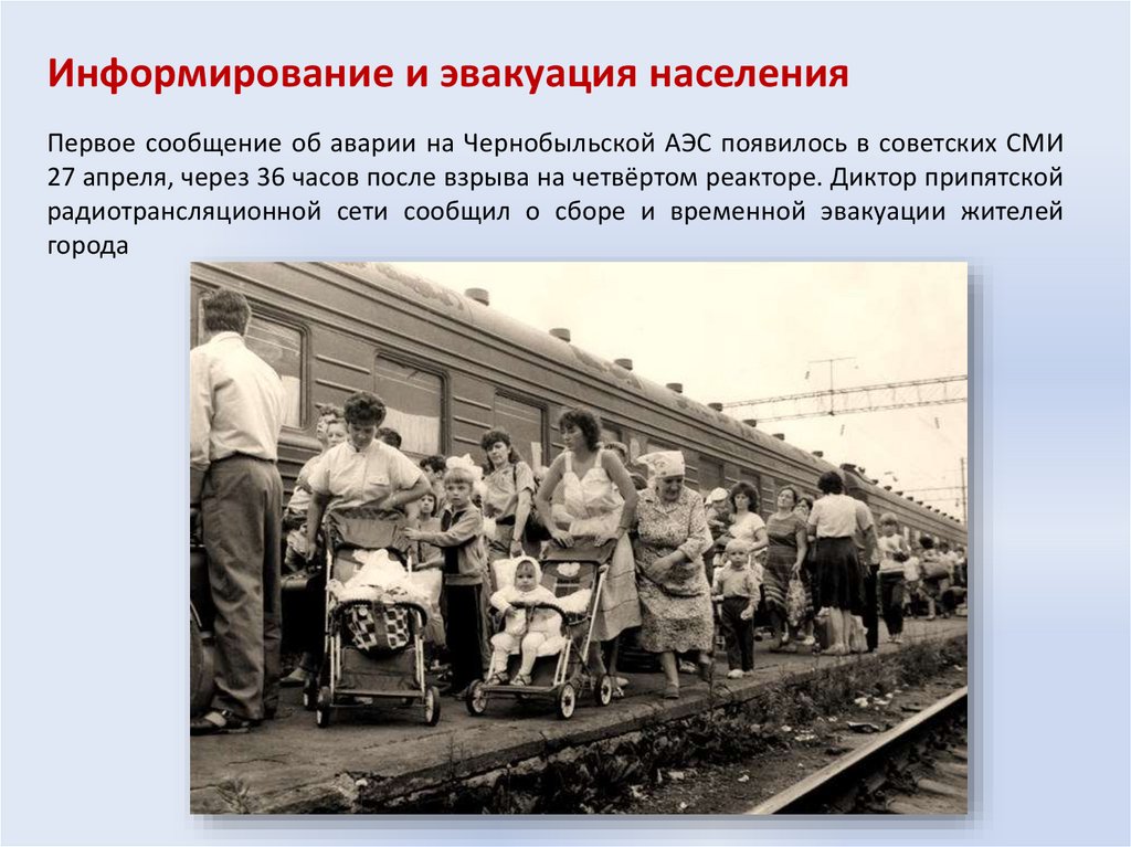 Информирование и эвакуация населенияПервое сообщение об аварии на Чернобыльской АЭС появилось в советских СМИ