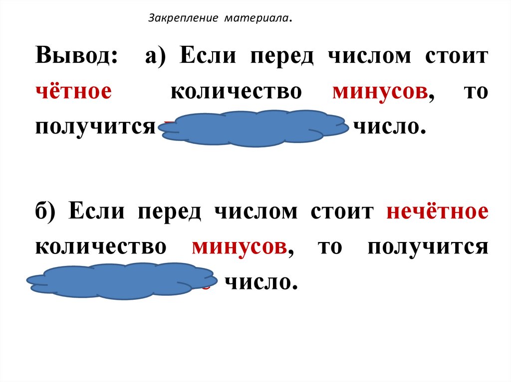 Закрепление материала.Вывод: а) Если перед числом стоит