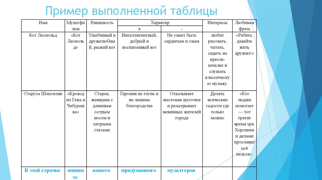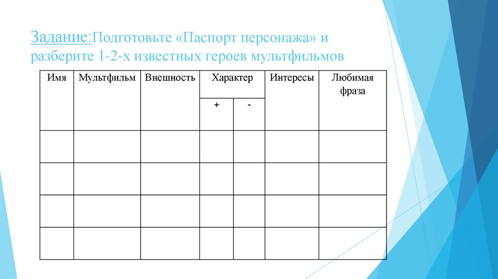 Задание:Подготовьте «Паспорт персонажа» иразберите 1-2-х известных героев мультфильмов