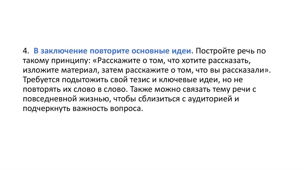 4. В заключение повторите основные идеи. Постройте речь потакому принципу: «Расскажите о том, что хотите рассказать,