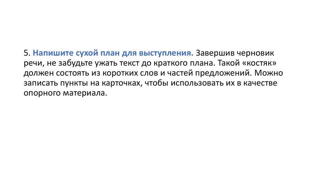 5. Напишите сухой план для выступления. Завершив черновикречи, не забудьте ужать текст до краткого плана. Такой «костяк»