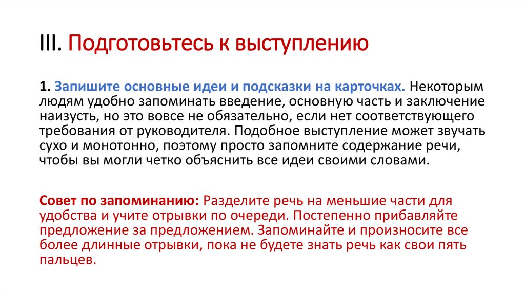 III. Подготовьтесь к выступлению1. Запишите основные идеи и подсказки на карточках. Некоторым