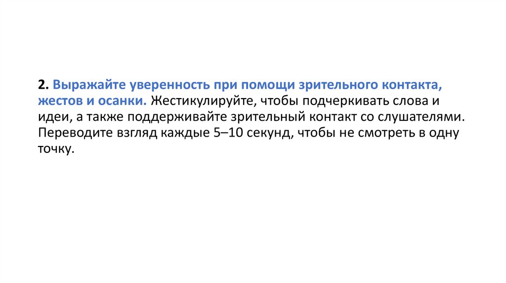 2. Выражайте уверенность при помощи зрительного контакта,жестов и осанки. Жестикулируйте, чтобы подчеркивать слова и
