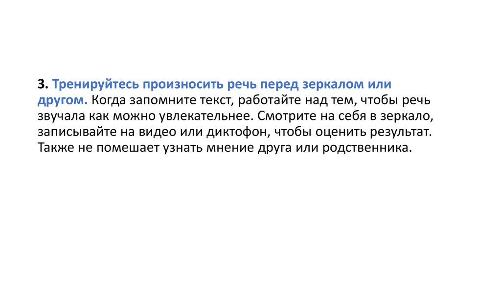 3. Тренируйтесь произносить речь перед зеркалом илидругом. Когда запомните текст, работайте над тем, чтобы речь