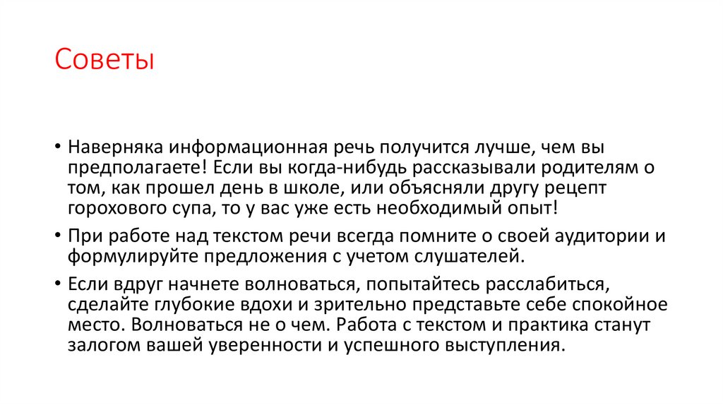 Советы• Наверняка информационная речь получится лучше, чем вы