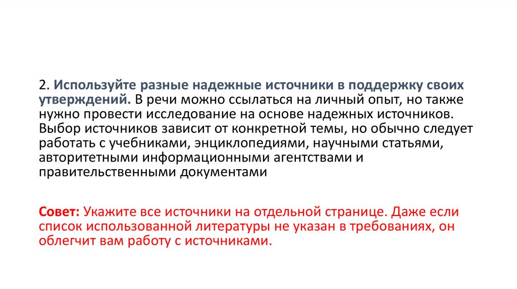 2. Используйте разные надежные источники в поддержку своихутверждений. В речи можно ссылаться на личный опыт, но также