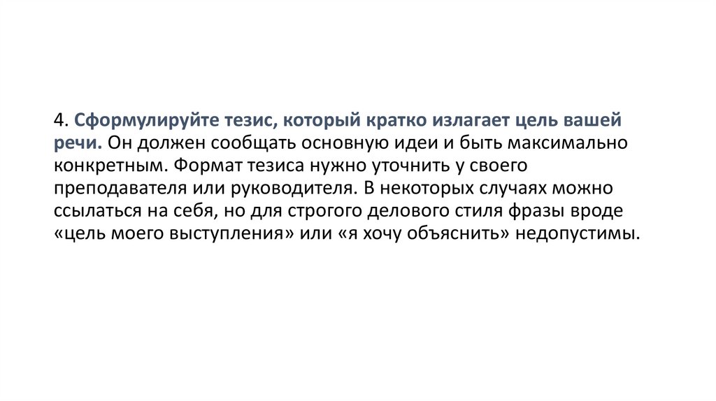 4. Сформулируйте тезис, который кратко излагает цель вашейречи. Он должен сообщать основную идеи и быть максимально