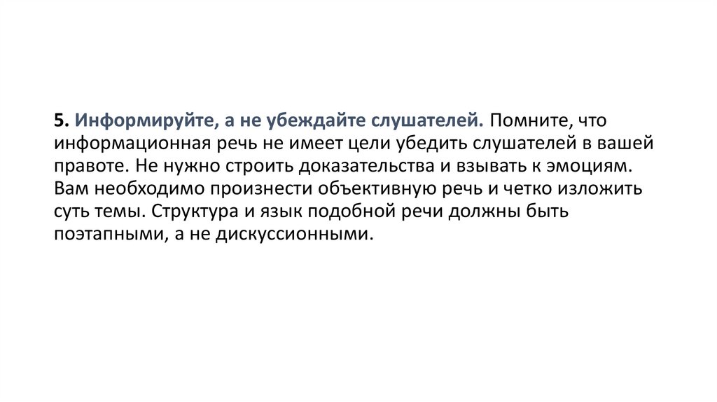 5. Информируйте, а не убеждайте слушателей. Помните, чтоинформационная речь не имеет цели убедить слушателей в вашей