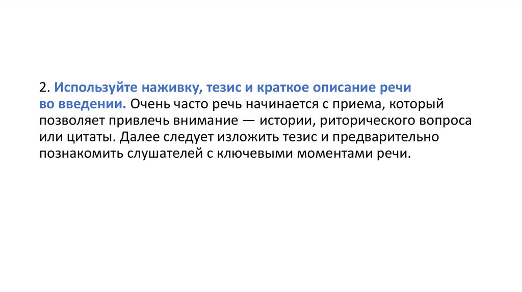 2. Используйте наживку, тезис и краткое описание речиво введении. Очень часто речь начинается с приема, который