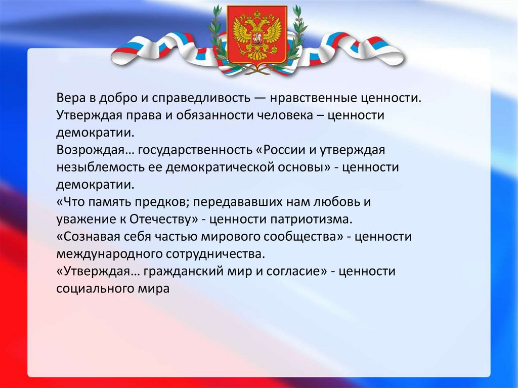 Вера в добро и справедливость — нравственные ценности.Утверждая права и обязанности человека – ценности