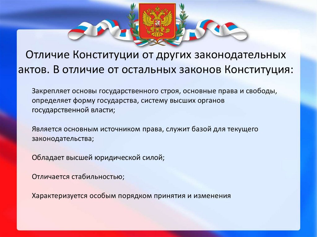 Отличие Конституции от других законодательныхактов. В отличие от остальных законов Конституция: