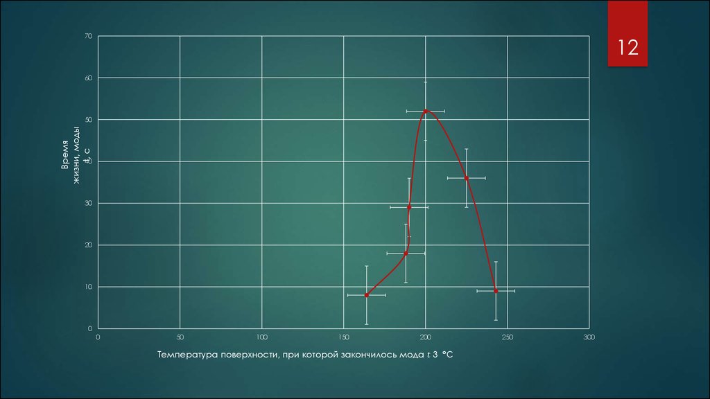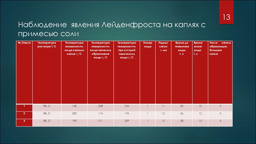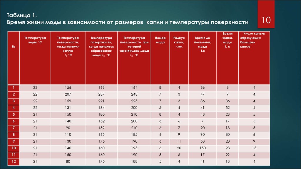 Таблица 1.Время жизни моды в зависимости от размеров капли и температуры поверхности