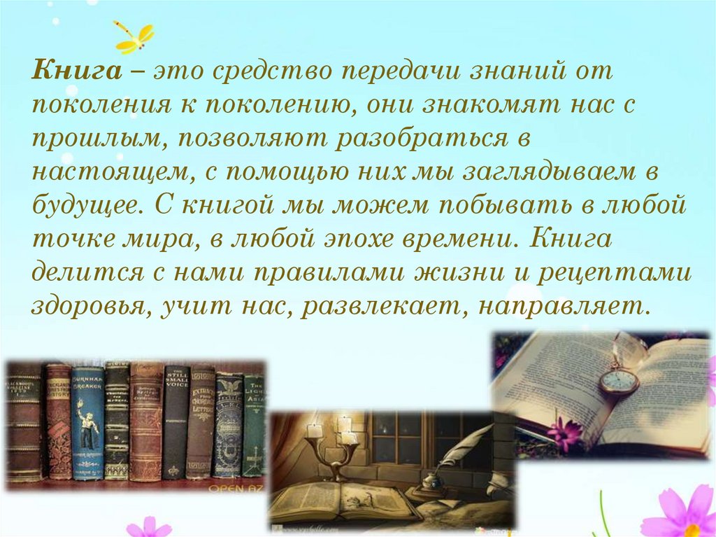 Книга – это средство передачи знаний отпоколения к поколению, они знакомят нас с