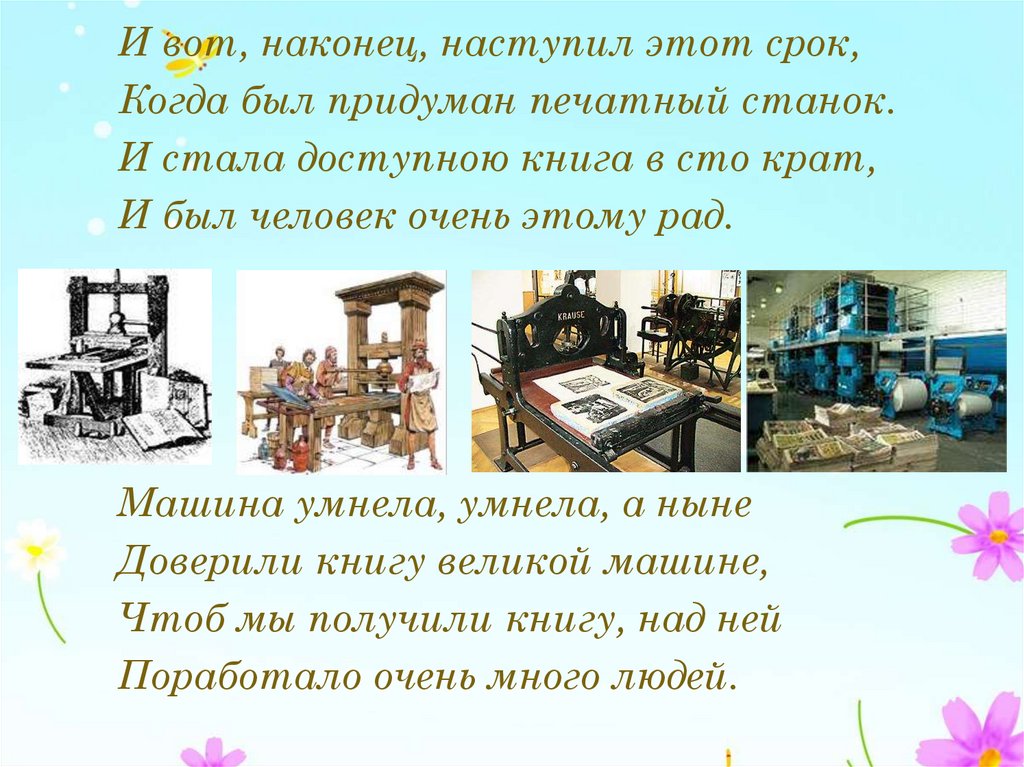 И вот, наконец, наступил этот срок,Когда был придуман печатный станок.