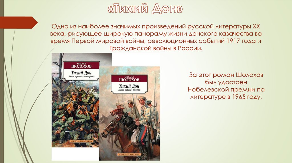 Одно из наиболее значимых произведений русской литературы XXвека, рисующее широкую панораму жизни донского казачества во