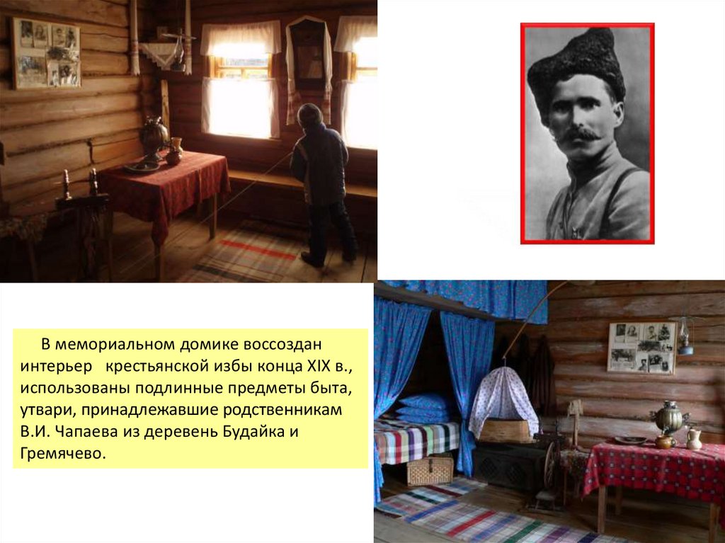 В мемориальном домике воссозданинтерьер крестьянской избы конца XIX в.,