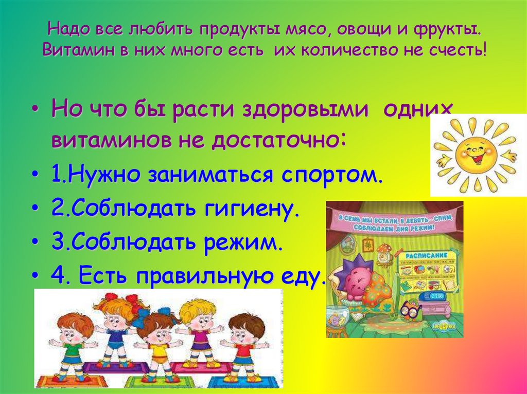 Надо все любить продукты мясо, овощи и фрукты.Витамин в них много есть их количество не счесть!