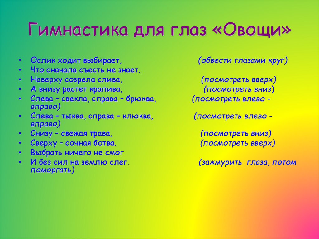 Гимнастика для глаз «Овощи»Ослик ходит выбирает,
