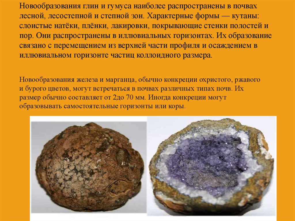 Новообразования глин и гумуса наиболее распространены в почвахлесной, лесостепной и степной зон. Характерные формы — кутаны: