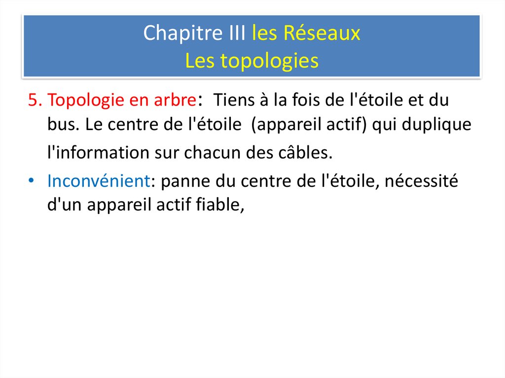 • Inconvénient: la fiabilité du réseau est Dépend de la