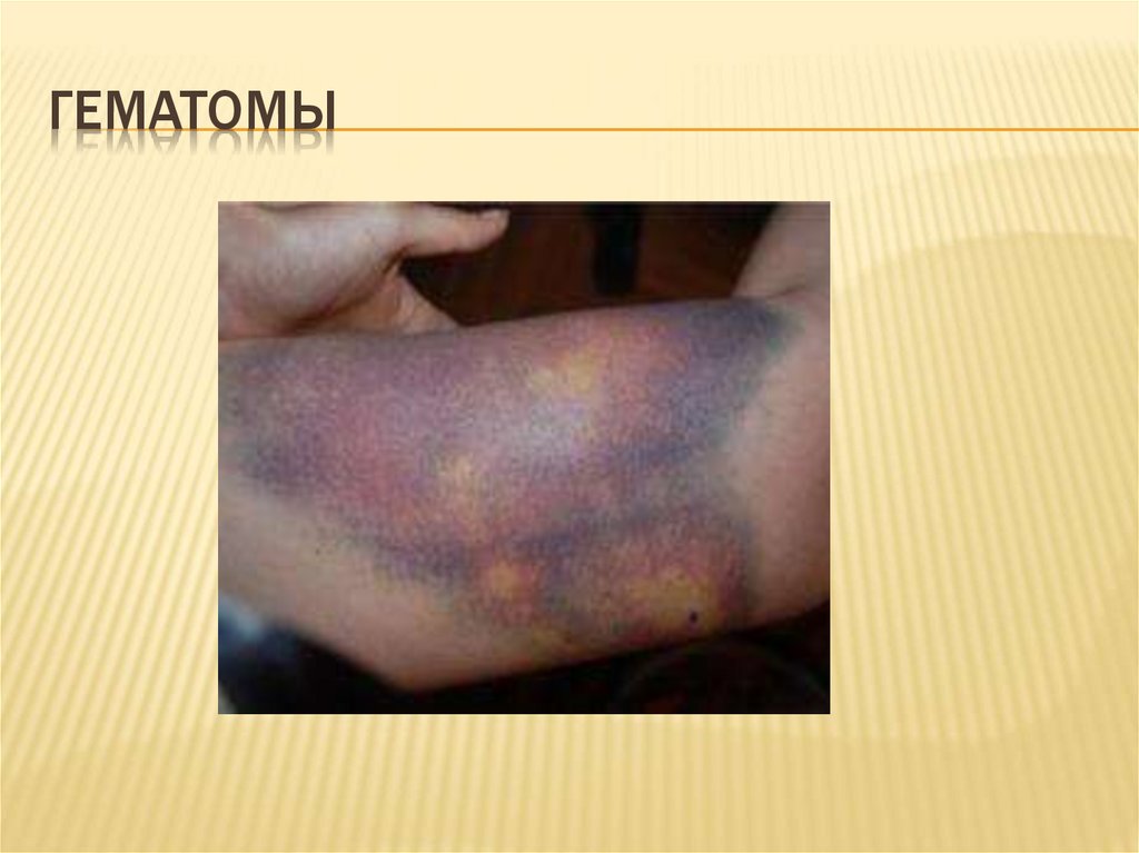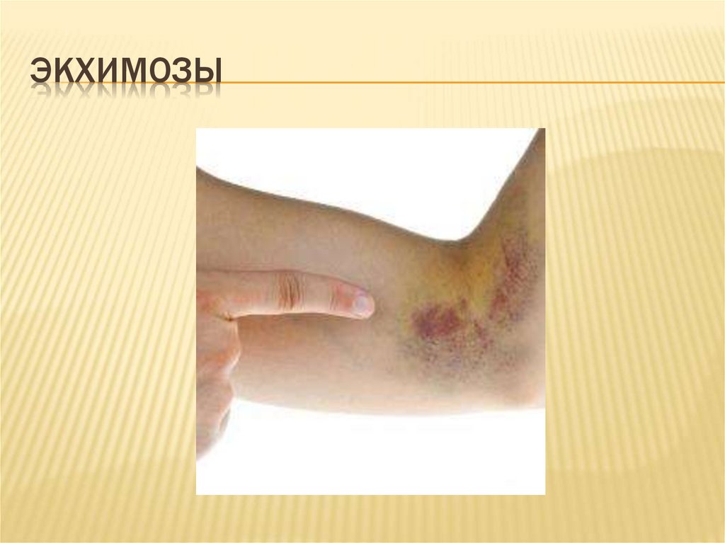 Крупные кровоподтеки в результате травмы - это экхимозы;