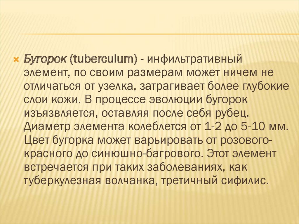Бугорок (tuberculum) - инфильтративныйэлемент, по своим размерам может ничем не
