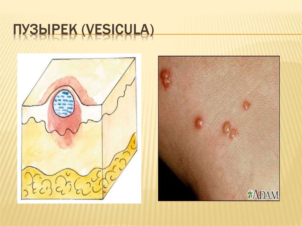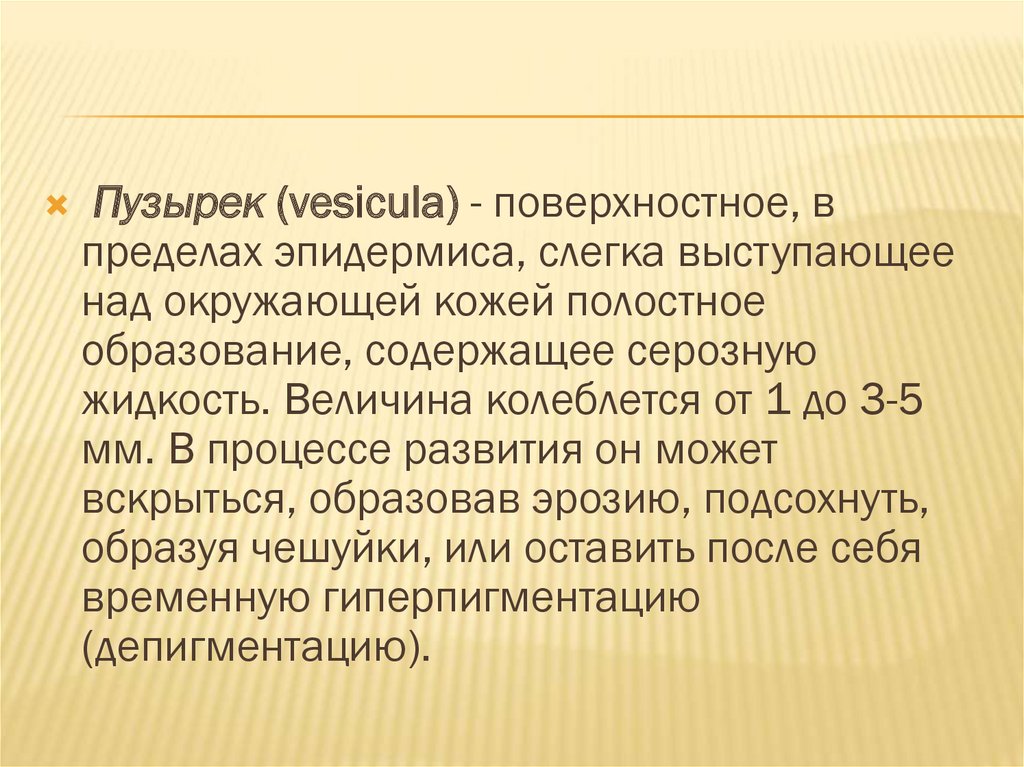 Пузырек (vesicula) - поверхностное, впределах эпидермиса, слегка выступающее