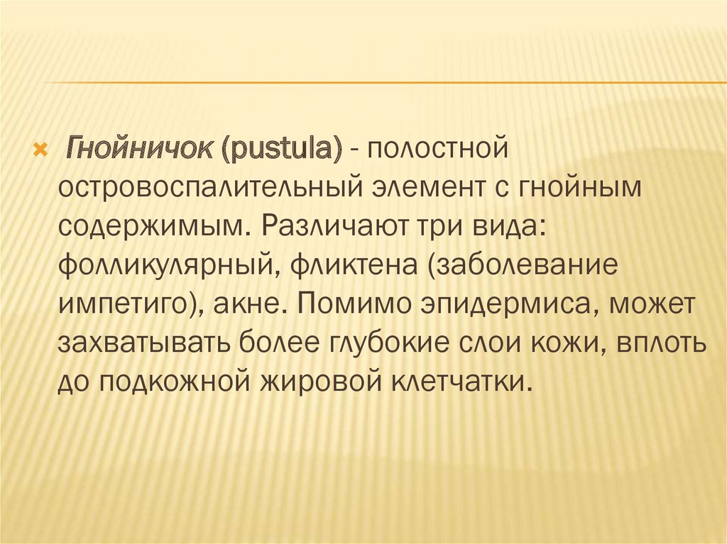 Гнойничок (pustula) - полостнойостровоспалительный элемент с гнойным