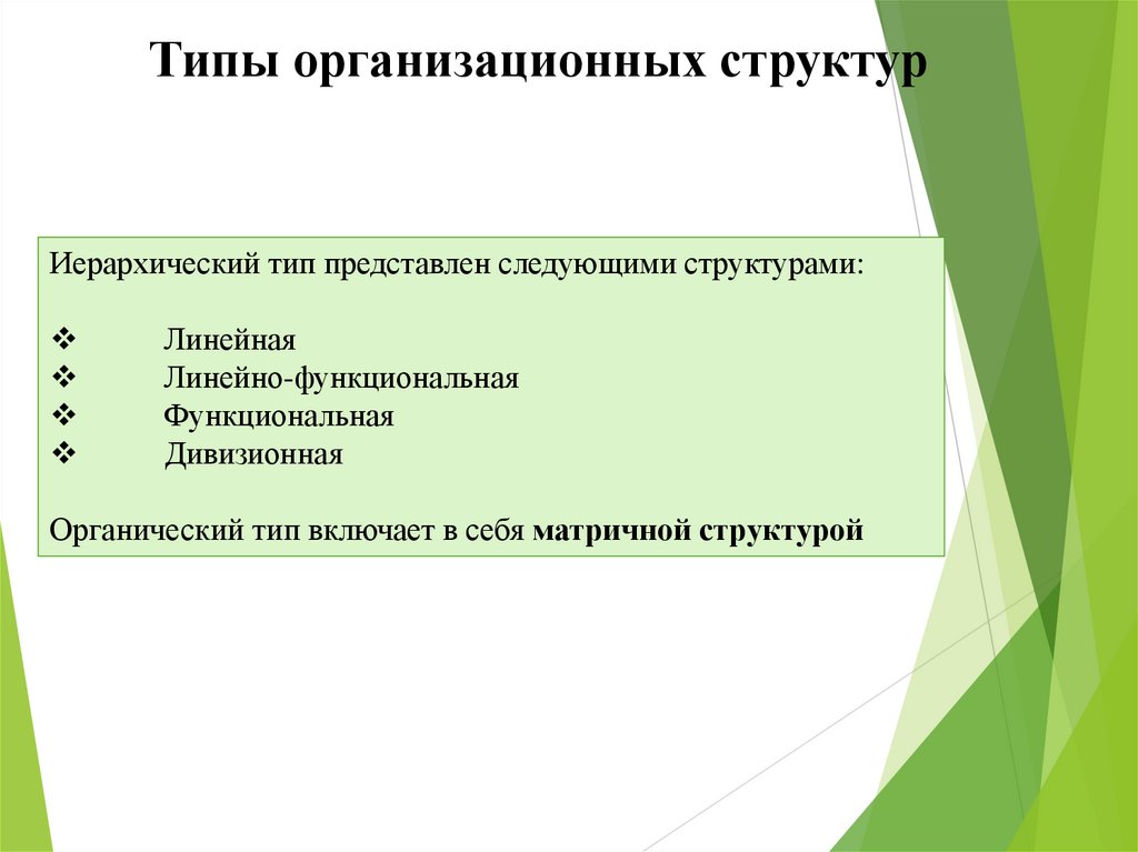 Типы организационных структурИерархический тип представлен следующими структурами: