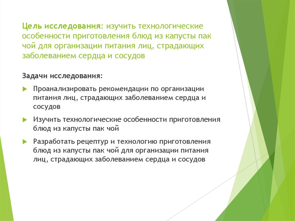 Цель исследования: изучить технологическиеособенности приготовления блюд из капусты пак