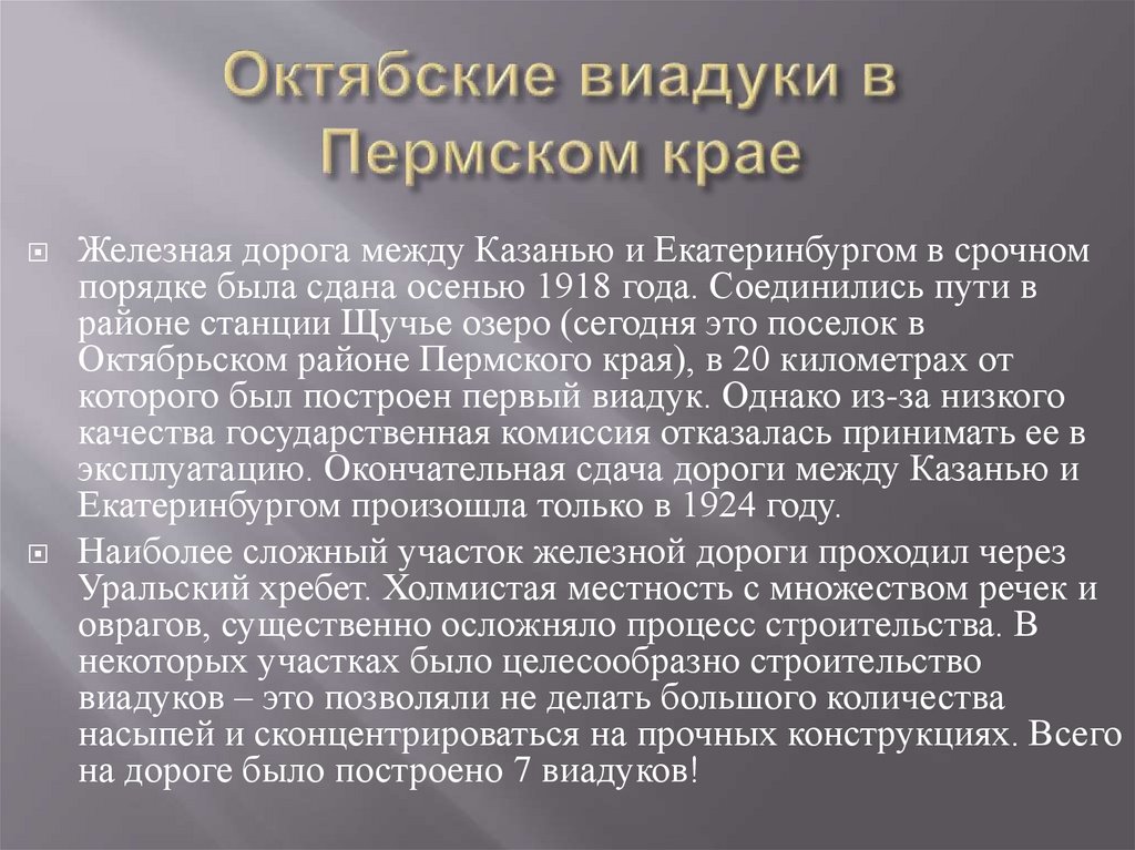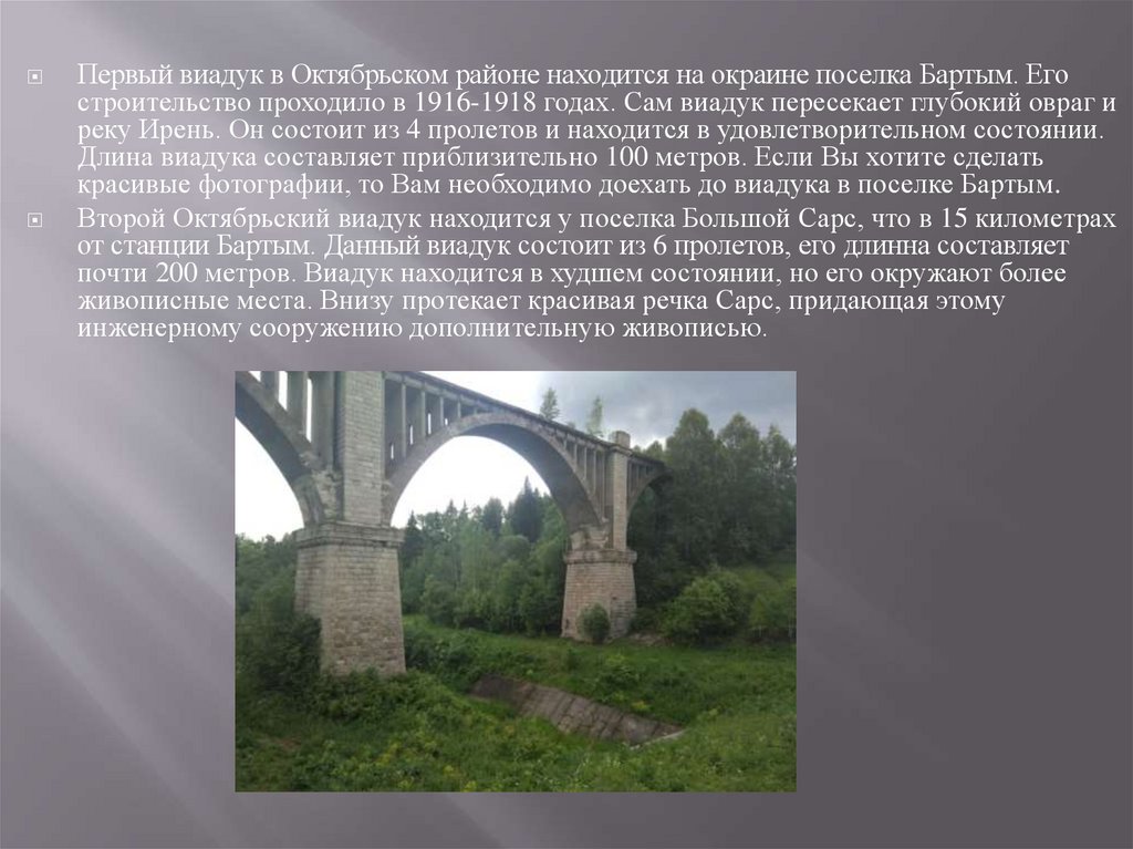 Первый виадук в Октябрьском районе находится на окраине поселка Бартым. Егостроительство проходило в 1916-1918 годах. Сам виадук пересекает глубокий овраг и