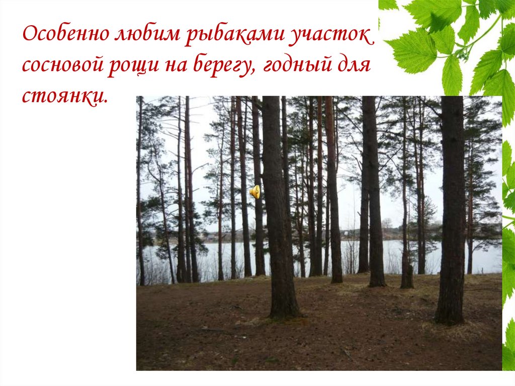 Особенно любим рыбаками участоксосновой рощи на берегу, годный для