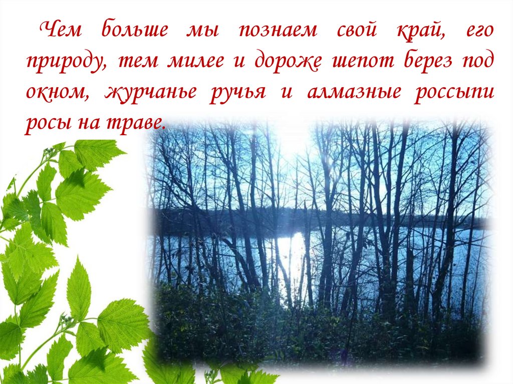 Чем больше мы познаем свой край, егоприроду, тем милее и дороже шепот берез под