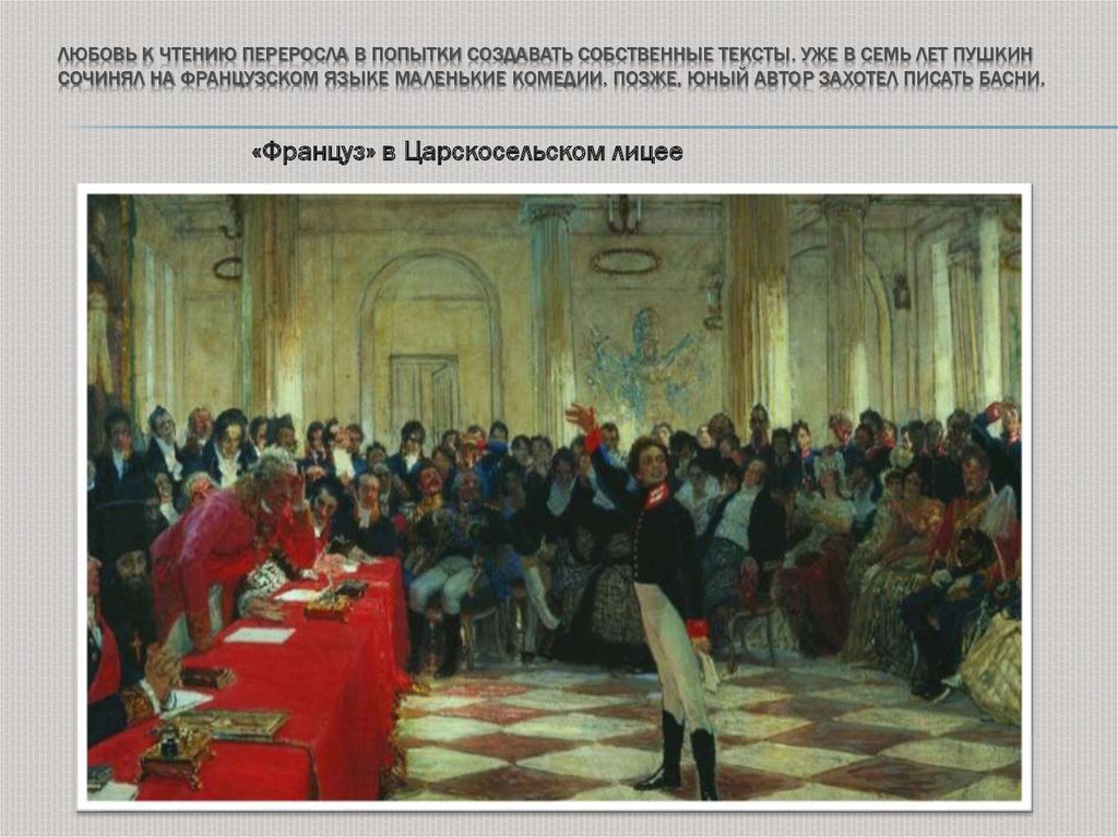 ЛЮБОВЬ К ЧТЕНИЮ ПЕРЕРОСЛА В ПОПЫТКИ СОЗДАВАТЬ СОБСТВЕННЫЕ ТЕКСТЫ. УЖЕ В СЕМЬ ЛЕТ ПУШКИНСОЧИНЯЛ НА ФРАНЦУЗСКОМ ЯЗЫКЕ МАЛЕНЬКИЕ КОМЕДИИ. ПОЗЖЕ, ЮНЫЙ АВТОР ЗАХОТЕЛ ПИСАТЬ БАСНИ.