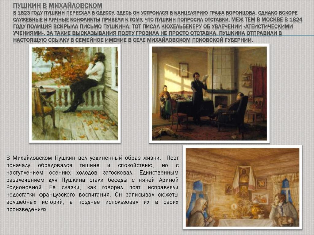 ПУШКИН В МИХАЙЛОВСКОМВ 1823 ГОДУ ПУШКИН ПЕРЕЕХАЛ В ОДЕССУ. ЗДЕСЬ ОН УСТРОИЛСЯ В КАНЦЕЛЯРИЮ ГРАФА ВОРОНЦОВА. ОДНАКО ВСКОРЕ