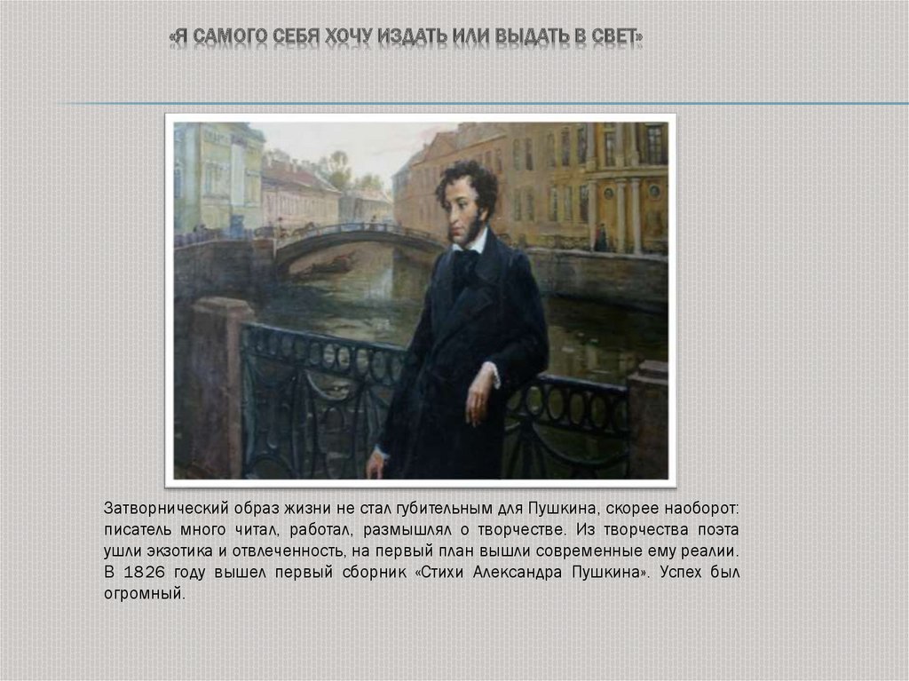 «Я САМОГО СЕБЯ ХОЧУ ИЗДАТЬ ИЛИ ВЫДАТЬ В СВЕТ»Затворнический образ жизни не стал губительным для Пушкина, скорее наоборот: