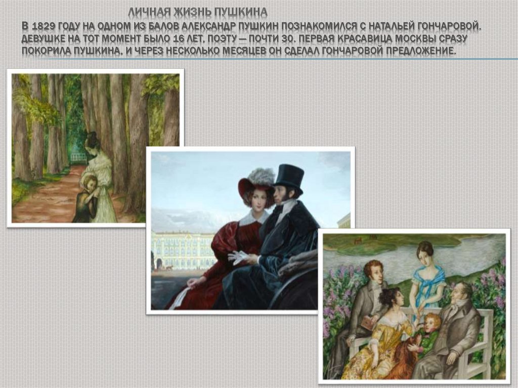 ЛИЧНАЯ ЖИЗНЬ ПУШКИНАВ 1829 ГОДУ НА ОДНОМ ИЗ БАЛОВ АЛЕКСАНДР ПУШКИН ПОЗНАКОМИЛСЯ С НАТАЛЬЕЙ ГОНЧАРОВОЙ.