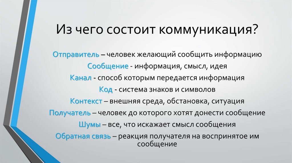 Из чего состоит коммуникация?Отправитель – человек желающий сообщить информацию