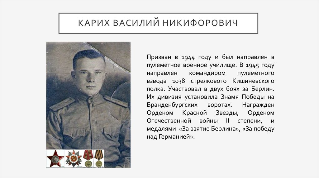КАРИХ ВАСИЛИЙ НИКИФОРОВИЧПризван в 1944 году и был направлен в