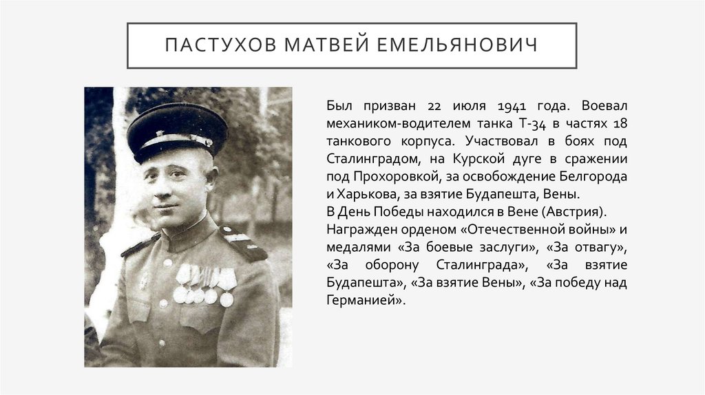 ПАСТУХОВ МАТВЕЙ ЕМЕЛЬЯНОВИЧБыл призван 22 июля 1941 года. Воевал