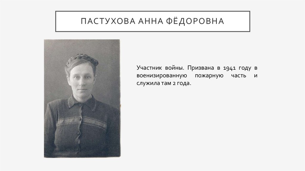 ПАСТУХОВА АННА ФЁДОРОВНАУчастник войны. Призвана в 1941 году в