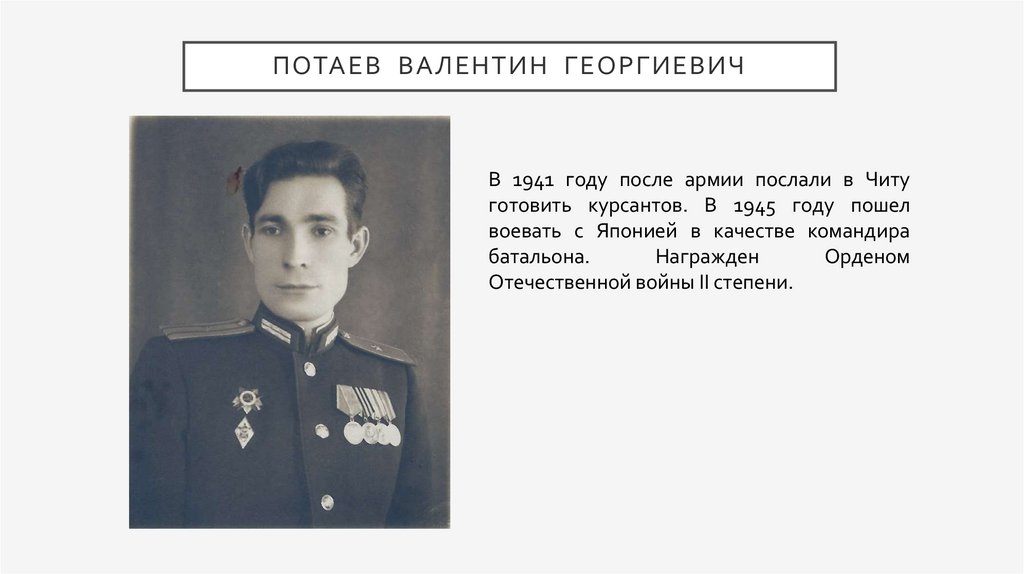 ПОТАЕВ ВАЛЕНТИН ГЕОРГИЕВИЧВ 1941 году после армии послали в Читу