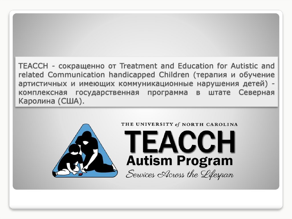 ТЕАССН - сокращенно от Treatment and Education for Autistic andrelated Communication handicapped Children (терапия и обучение