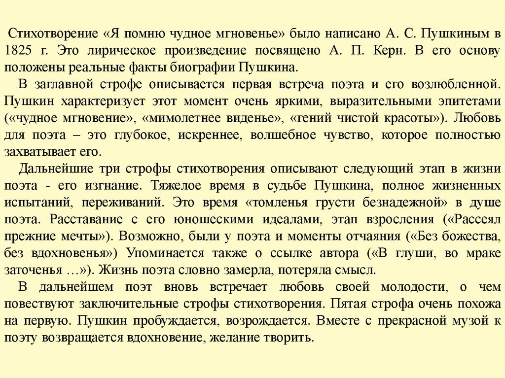 Стихотворение «Я помню чудное мгновенье» было написано А. С. Пушкиным в1825 г. Это лирическое произведение посвящено А. П. Керн. В его основу